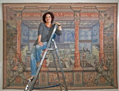 Маргрет Эйкер – немецкий художник-концептуалист, специализирующийся на гобеленах. Маргрет известна своими крупномасштабными гобеленами, в которых она сочетает барочную образность стиля со знакомыми и узнаваемыми изображениями нашего информационного общества. Их центральные мотивы относятся к актуальным образам репортажной фотографии и рекламе печатных и цифровых изданий. Иконы современного информационного общества собраны здесь в концептуально обоснованном пиратстве образов, основанном на самых разнообразных публичных источниках. Её творчество своего рода симбиоз, синтез и смешение классических традиций с современностью. Это качество делает ее гобелены актуальными.