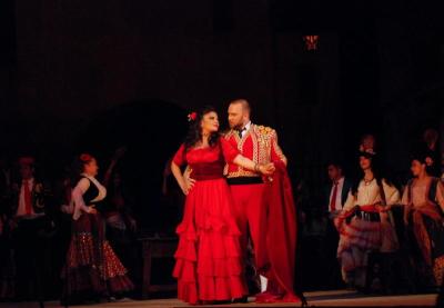 Чинара Ширин к этой партии шла долго, и само отношение к образу очень добросовестное, которое проявляется в мелочах - от яркой и нестандартной афиши (не хрестоматийное изображение цыганки с цветком в волосах, а портрет, решенный в эстетике Дж.Уистлера - красавица с развивающими волосами, прорывающейся сквозь кроваво-красное марево) до танца с кастаньетами, который требует определенных навыков этого танца, и не все исполнительницы титульной партии ими владеют. Прошел год, с тех пор как Чинара Ширин дебютировала в партии Кармен, и уже чувствуется ощутимая разница: на месте были голос, чистота интонирования и регистровые переклички, страсть и темперамент, актерское обаяние. Вокал Кармен-Ч.Ширин звучал экспрессивно, моментами завлекательно-жгуче и абсолютно свободно без напряжения в верхах (что, собственно, и следовало ожидать, учитывая прежний сопрановый опыт Ч.Ширин).